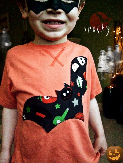 It was junior's playgroup halloween party today and for the first time he was actually interested in dressing up. He was begging me to use the new face paint so he became 'bat boy'. I appliqued two t shirts, this is the trial run version but he likes it better than the other one.
