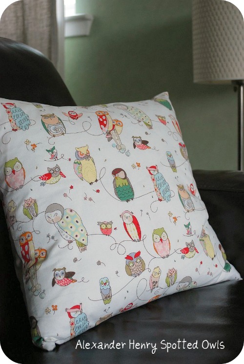 I used some of Alexander Henry’s Spotted owls fabric, which I had stashed for this exact purpose about a year ago. The back is some Kona cotton in stone and the trim is Amy Butler of course, I love this fabric but then I seem to have a thing about dots at the moment.